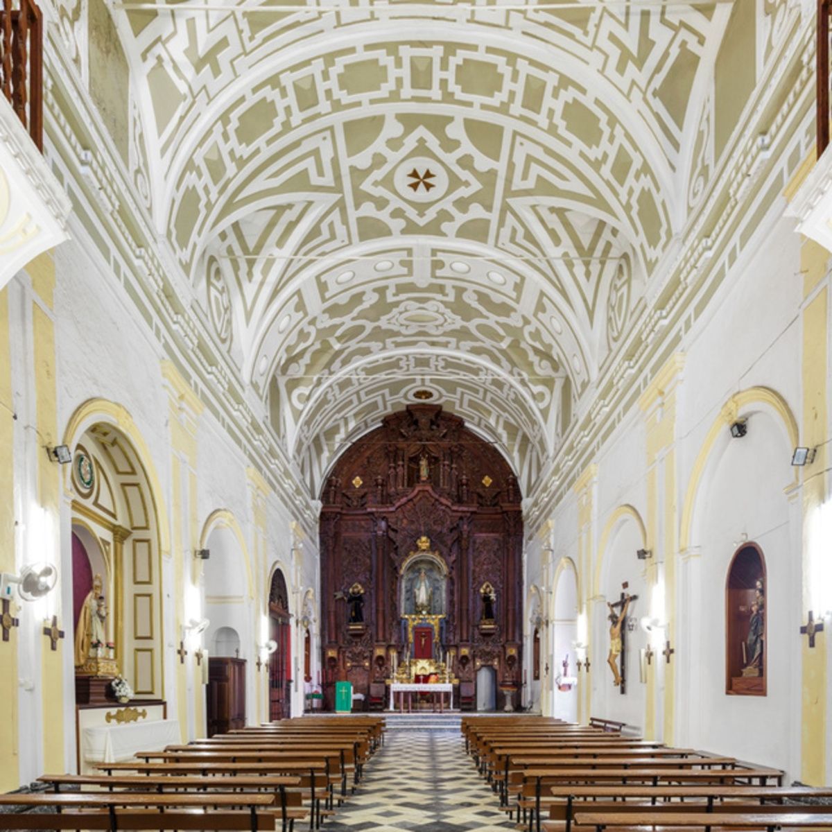 A los pies, coro alto sustentado por doble lila de columnas con tres vanos. La iglesia contiene una cofradía llamada del Cristo de la Agonía y Nuestra Señora de Loreto.