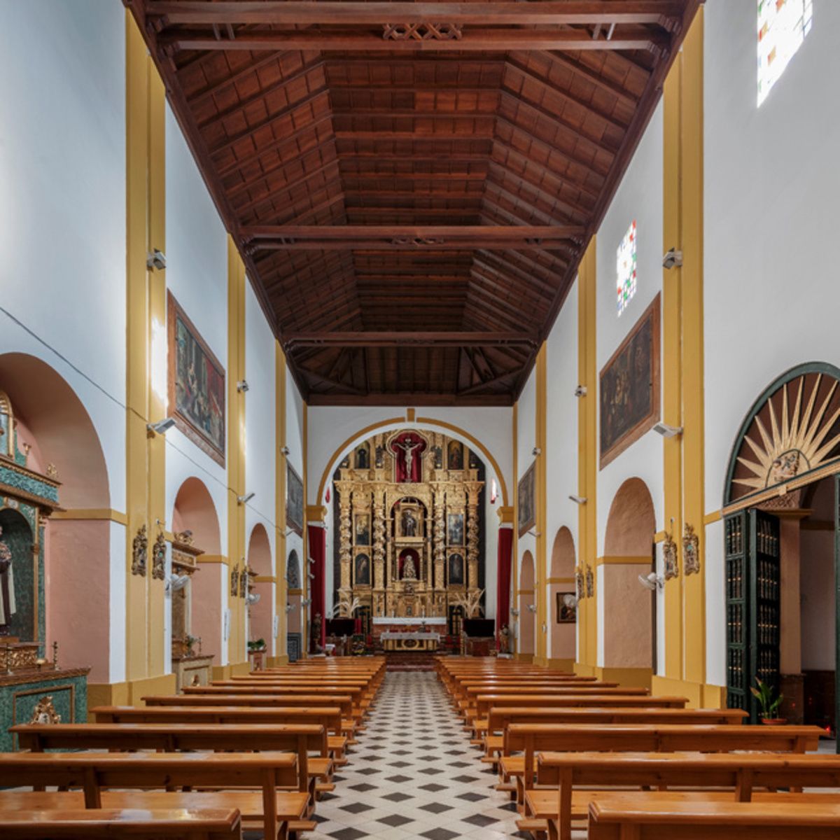 Consta de una planta rectangular y de una sola nave de cinco tramos y capilla mayor independiente unida por arcos de medio punto.