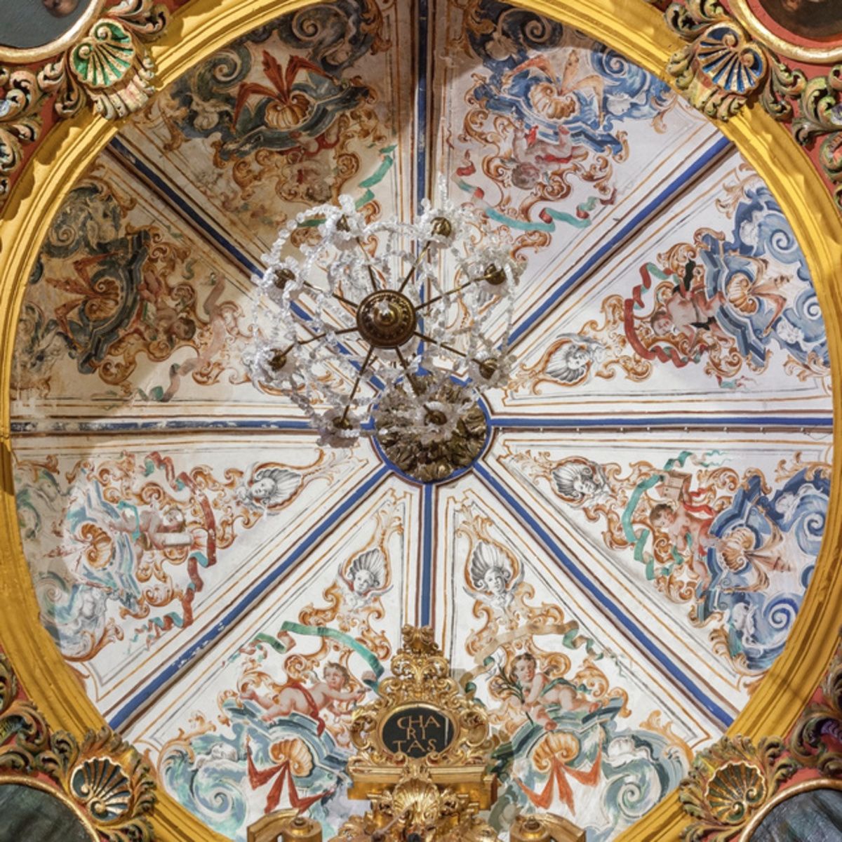 Hay que mencionar que en las enjuntas del arco observamos una decoración de tipo vegetal y ángeles con palmas que se pueden fechar en el tercer tercio de siglo XVII. La torre presenta estructura cilíndrica y consta de un cuerpo de campanas con vanos flanqueados por pilastras de estilo jónico y un chapitel de forma piramidal decorado con azulejos.