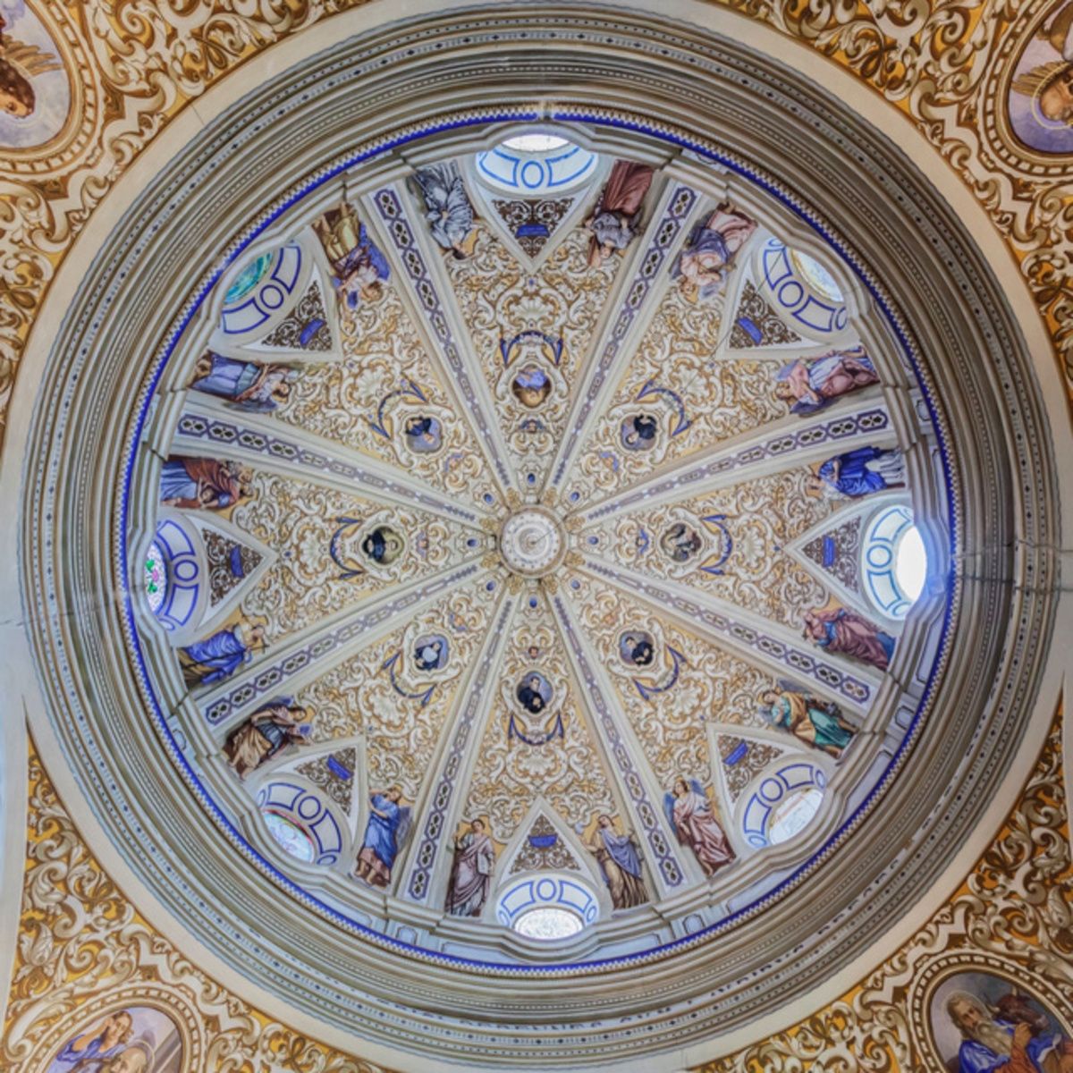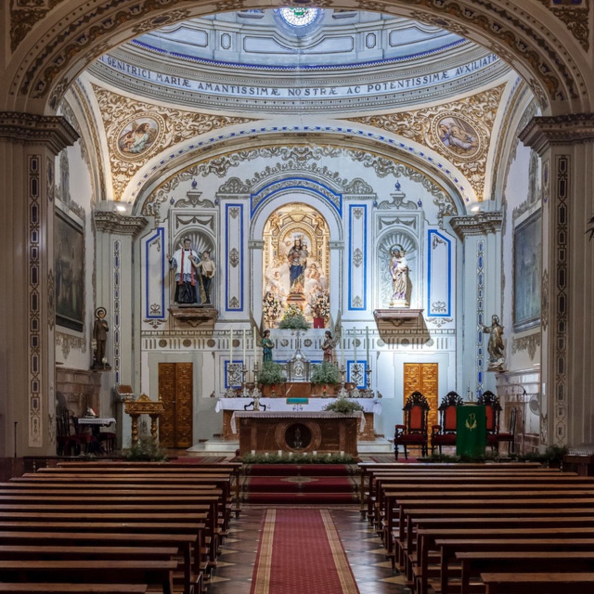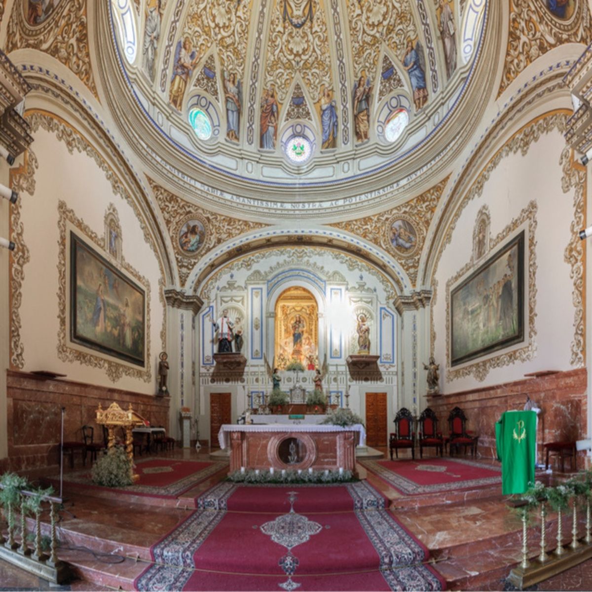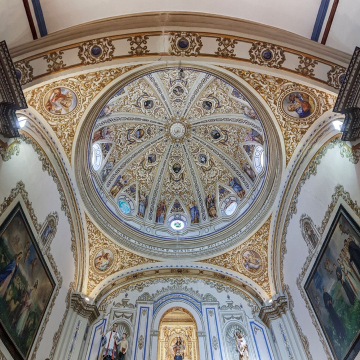 Los cuatro evangelistas aparecen representados en las pechinas de la cúpula, y en el friso que circunda la media naranja aparece la siguiente leyenda: "TOTA PULCRA ES MARIA ET MACULA ORIGALIS NON EST IN TE ALMAE DEL GENITRICI MARIA AMANTISSIMAE AC PROTENTISSIMAE AUXILIATRICI PERENNES CUN LAUDIBUS PRECES".