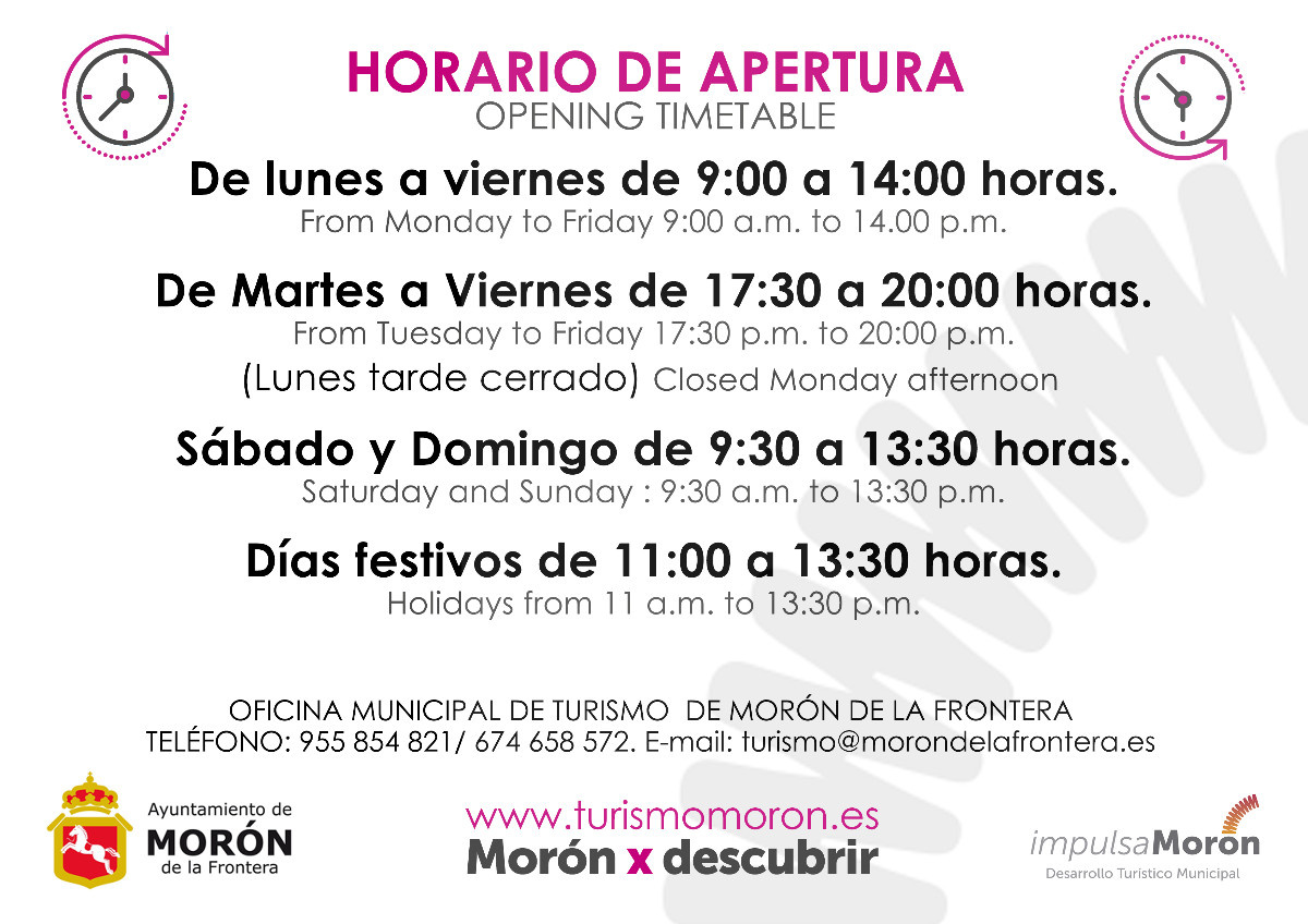 Esta oficina de turismo ofrece a todos sus visitantes información turística de Morón de la Frontera y su entorno así como de la oferta turística más destacada de de los principales destinos turísticos de España. Atiende diariamente a turistas, excursionistas y a la propia población local, ofreciendo una información fiable, clara y precisa en diferentes idiomas, de forma accesible y personalizada.
